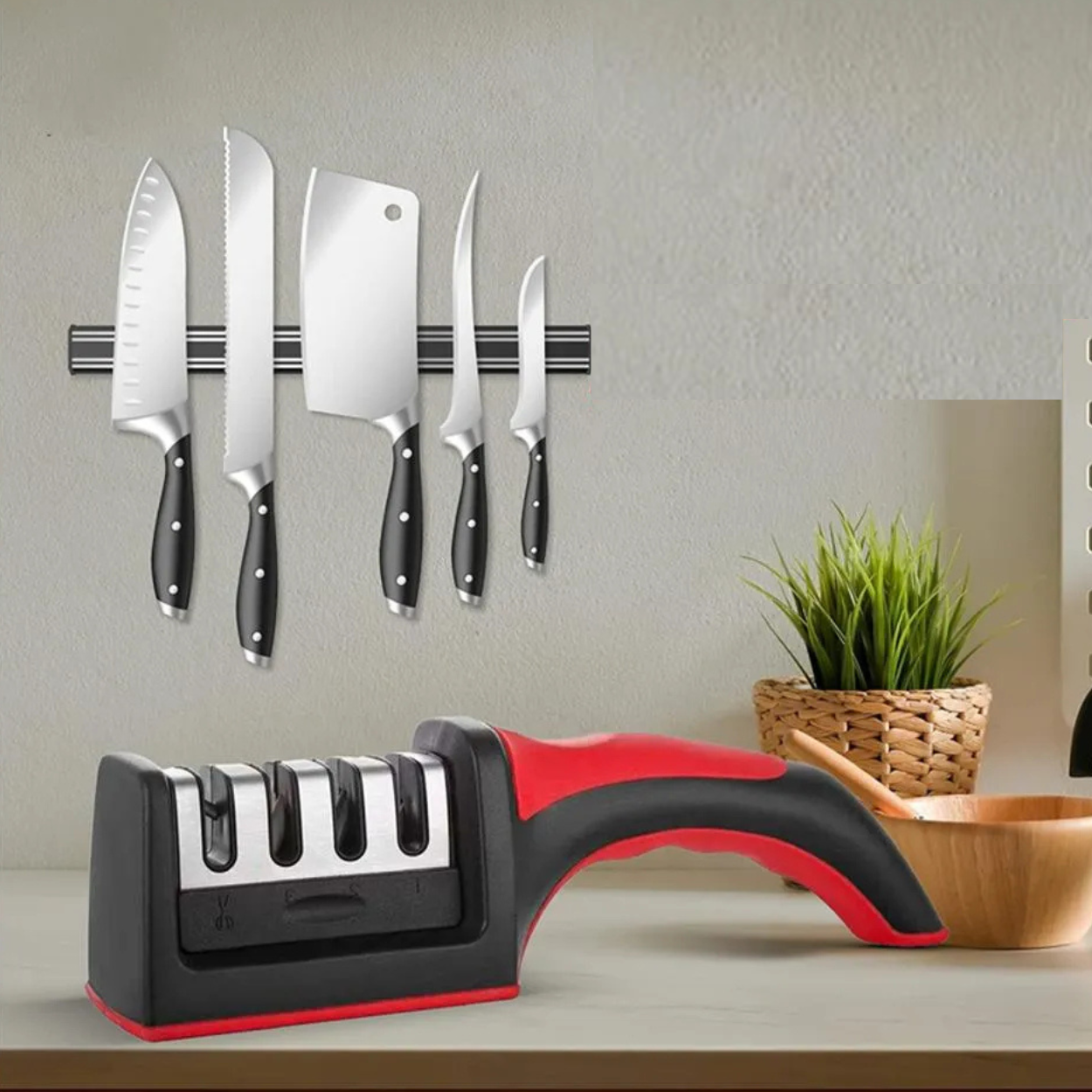 Renueva el filo de tus cuchillos como un profesional con nuestro afilador de 4 líneas. Diseñado para ofrecer un afilado progresivo, combina ranuras de carburo, cerámica y diamante para restaurar, afinar y pulir tus hojas con facilidad. Su base antideslizante y mango ergonómico garantizan estabilidad y comodidad en cada uso. Ideal para cuchillos de cocina, de chef y de uso diario.